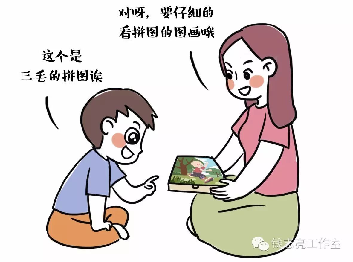 有些孩子在玩拼图游戏时,家长可有意识地引导孩子了解“部分”与“整体”的关系,让孩子知道许多的“部分”能拼凑出一个“整体”,以及一个“整体”是由许多“部分”所组成的。