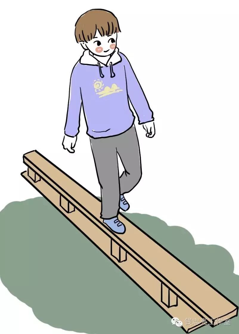 平衡:走平衡木速度慢,精神紧张,摇摆晃动。