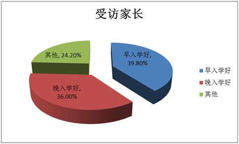 对于孩子早上学还是晚上学问题,39.8%的受访家长认为孩子晚入学好,36.0%的受访家长认为早入学好。具体来说,认为孩子晚上学的受访家长认为“早上学容易跟不上”,而认为应该早上学的家长觉得这样可以“为以后争取更多时间”。