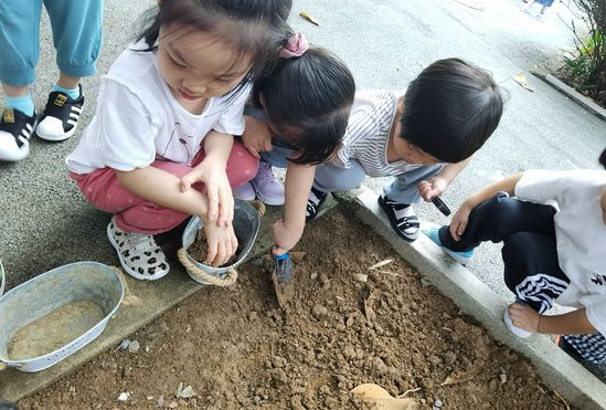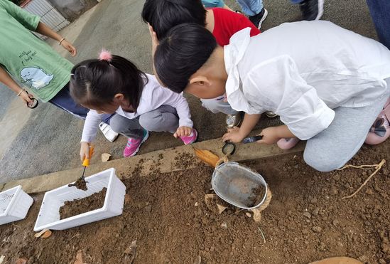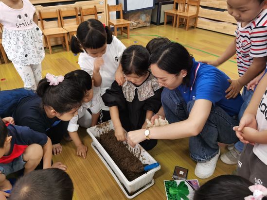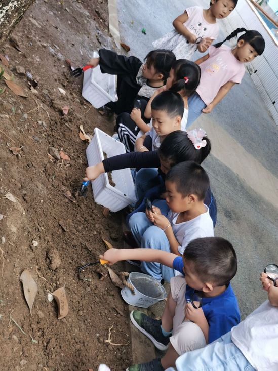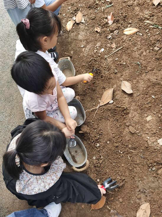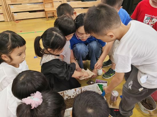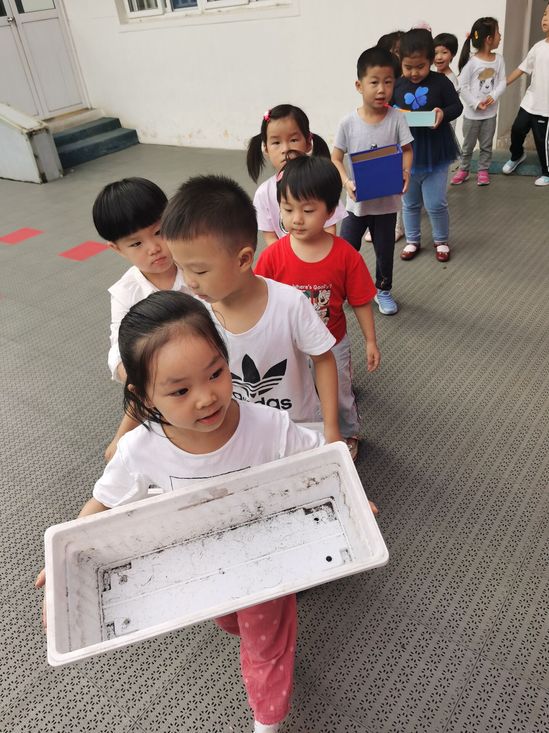 我们把泥土放进这个盒子里,这样我们回去就有泥土可以种植了