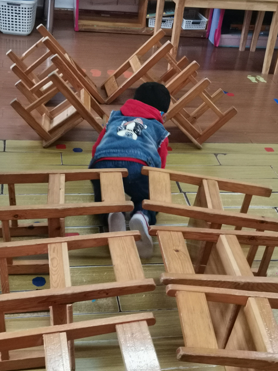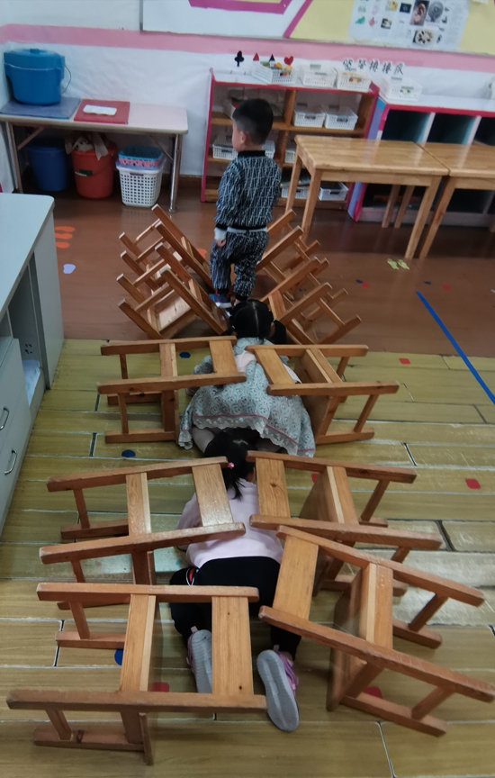 我们爬完大山洞就要过独木桥啦,