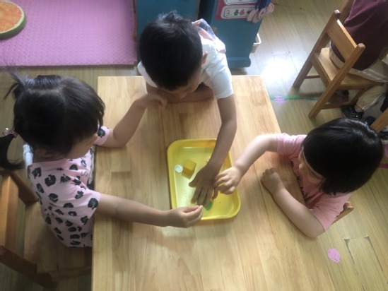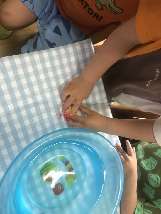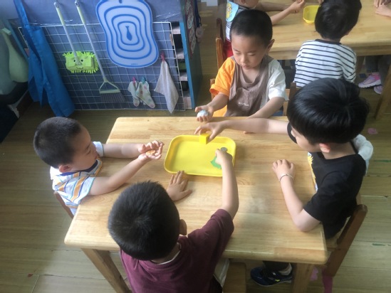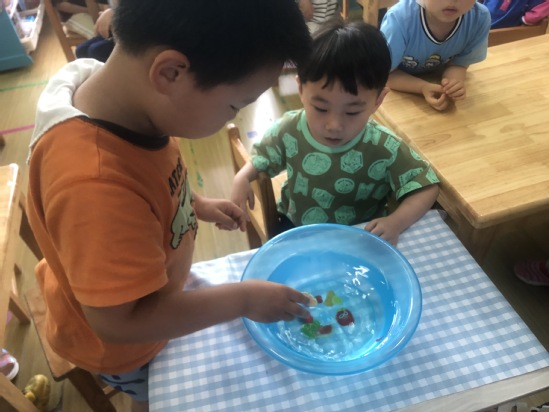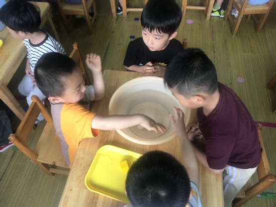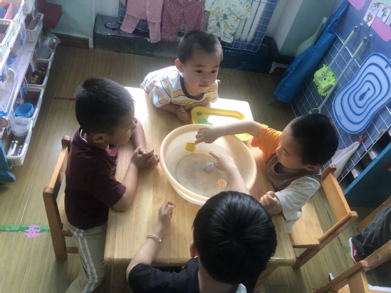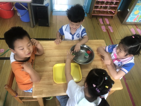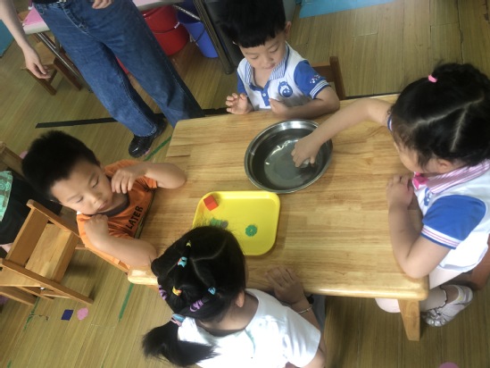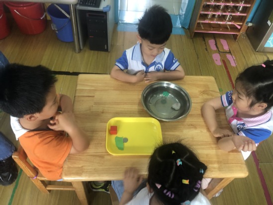 现在需要小朋友们动动脑筋,怎样利用橡皮泥使浮起来的雪花片沉下去呢?