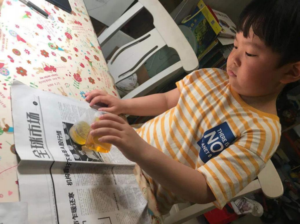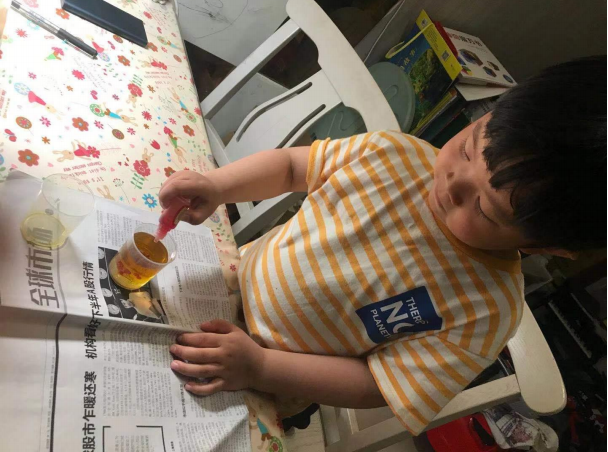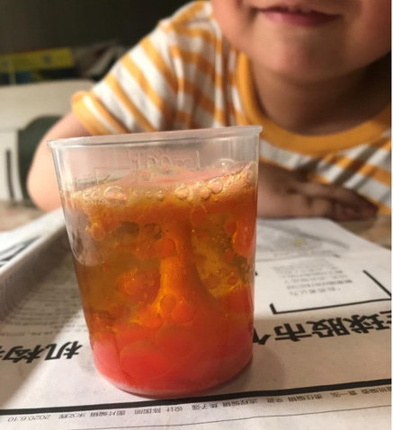 第一步:准备好 1/5 杯水、3/5 杯油,红色色素一瓶,一颗