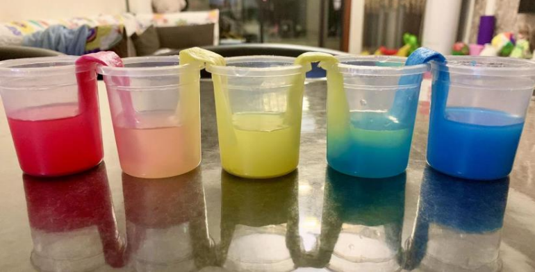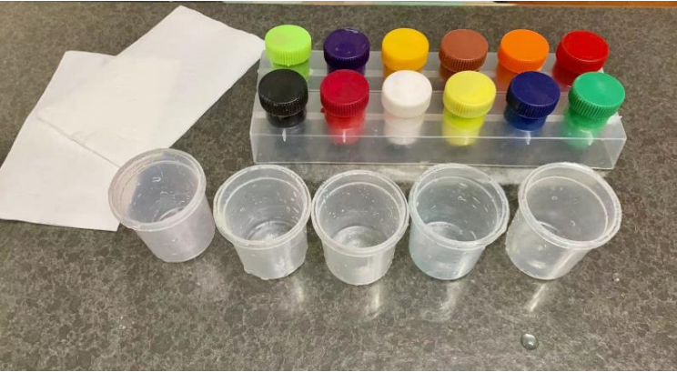 1. 准备材料:五个空杯子、颜料、纸巾。