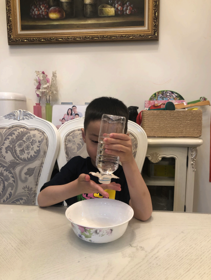 2、在瓶⼦⾥装⼊⾃来⽔,瓶⼝扎上纱布,倒置后