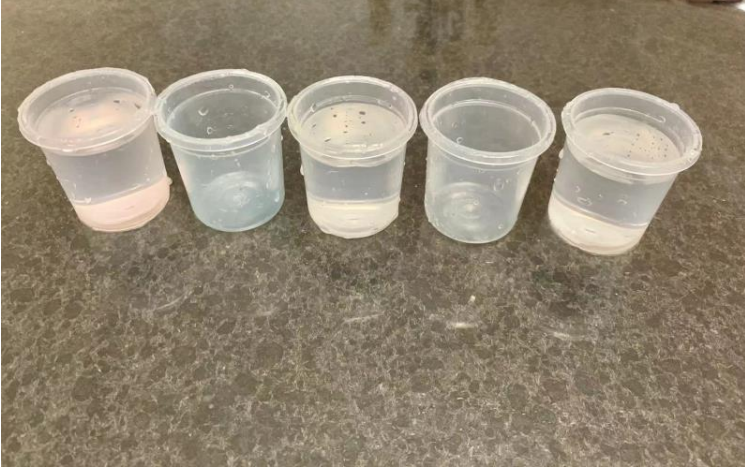 6. 半小时后,五个杯子里的水面一样高,原先的空杯子里出现了混合色。