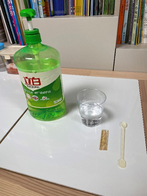 接下来,让我们往水中加入一个会“变魔法”的东西——洗洁精!